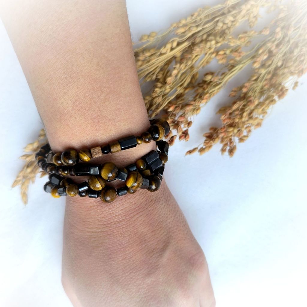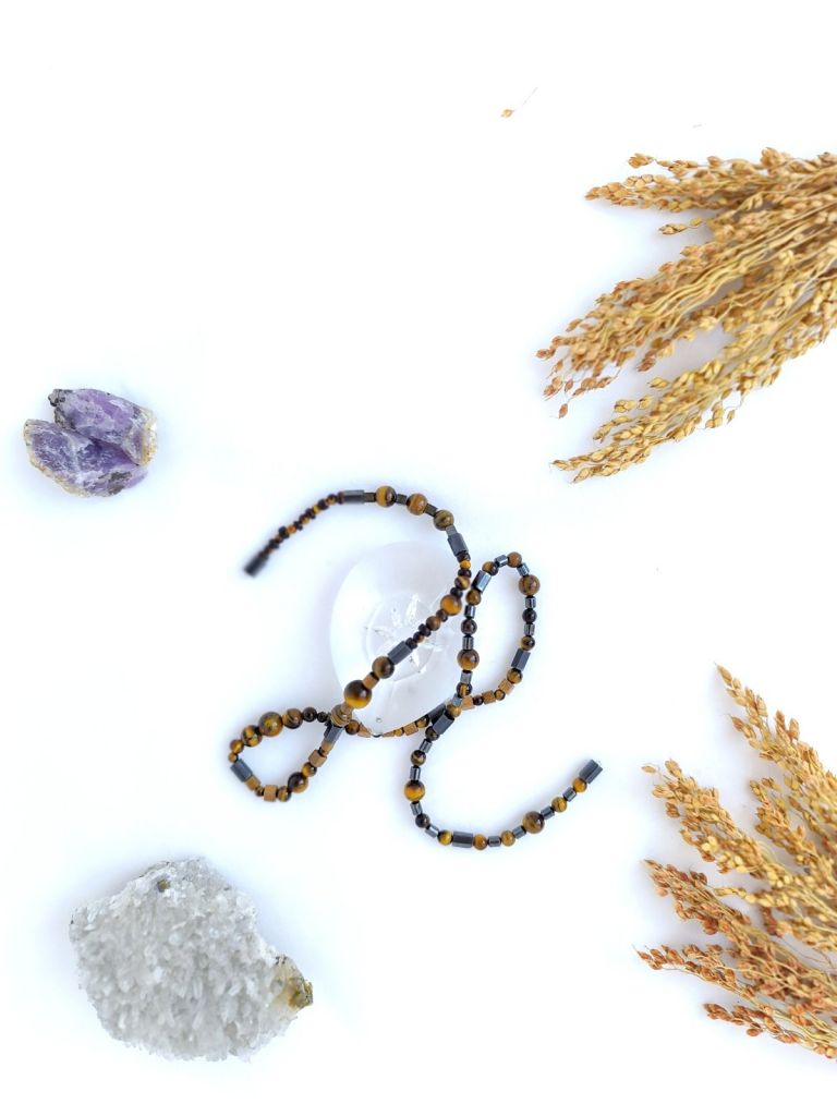 Аксесоар, изработен с магнитен хематит и естествени мъниста от тигрово око – перфектното допълнение към вашия стил! Този универсален дизайн няма закопчалка и позволява лесно носене по множество начини: като гривна за ръка, гривна за крак, колие или дори стилен аксесоар за вашата чанта.