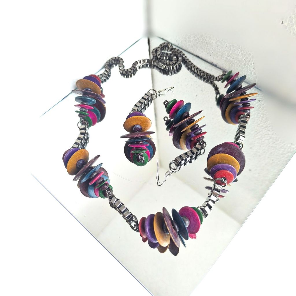 Потопи се в света на свободното себеизразяване с комплекта „Арт ми е“ – изящно съчетание от форми, цветове и енергия. Обеците и колието са ръчно изработени с внимание към детайла, носещи духа на творческата свобода и индивидуалност. Всеки елемент в комплекта е подбран така, че да подчертава твоята неподправена същност – без правила, без рамки. Нестандартни, но едновременно елегантни, тези бижута са създадени за душите, които обичат да творят – в живота, в стила си, в общуването със света.