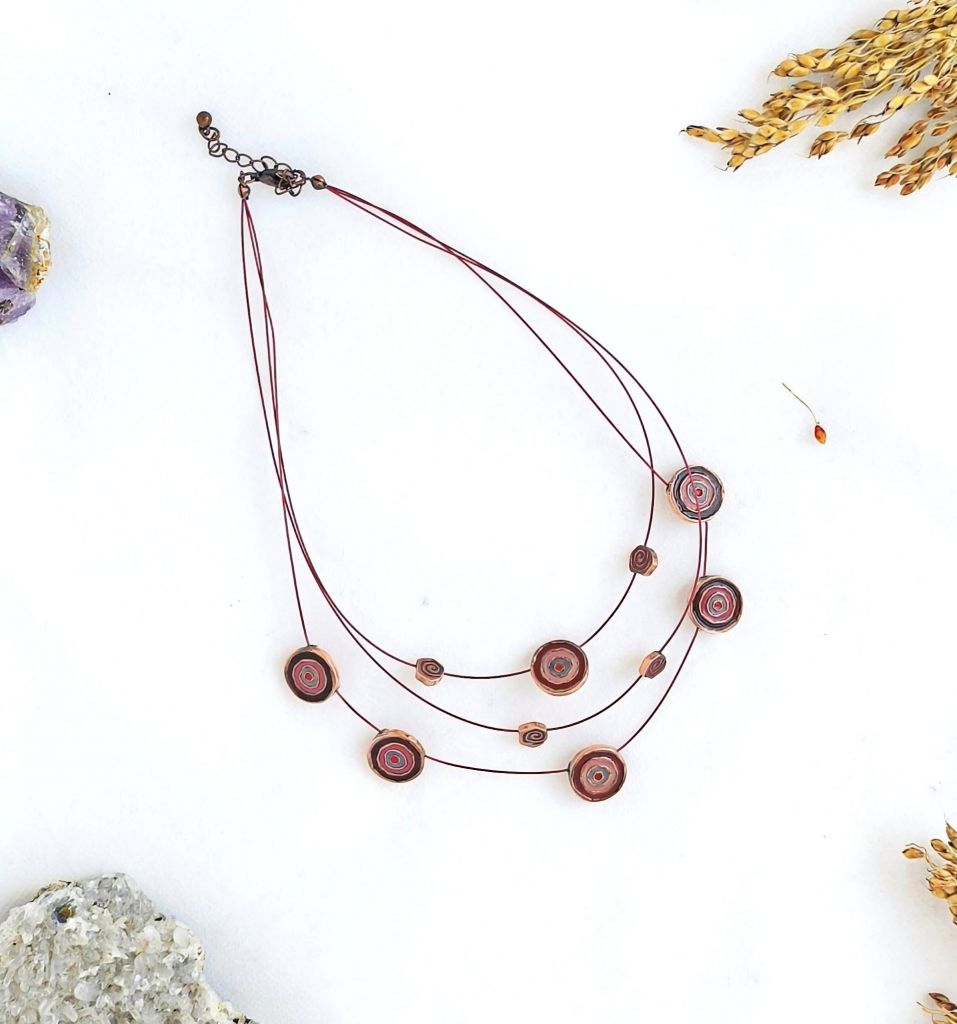 Колие, вдъхновено от енергията на земята и нейните естествени цикли. Топлите медни тонове и спираловидните елементи символизират движение, трансформация и връзката с корените ни. Лекият дизайн и асиметричната композиция го правят подходящо както за ежедневието, така и за специални поводи. Всяка спирала е уникална – като самата природа.