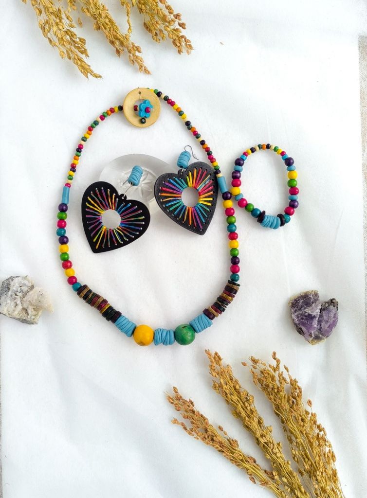 Комплект от ръчно изработени бижута, включващи колие, гривна и обици.