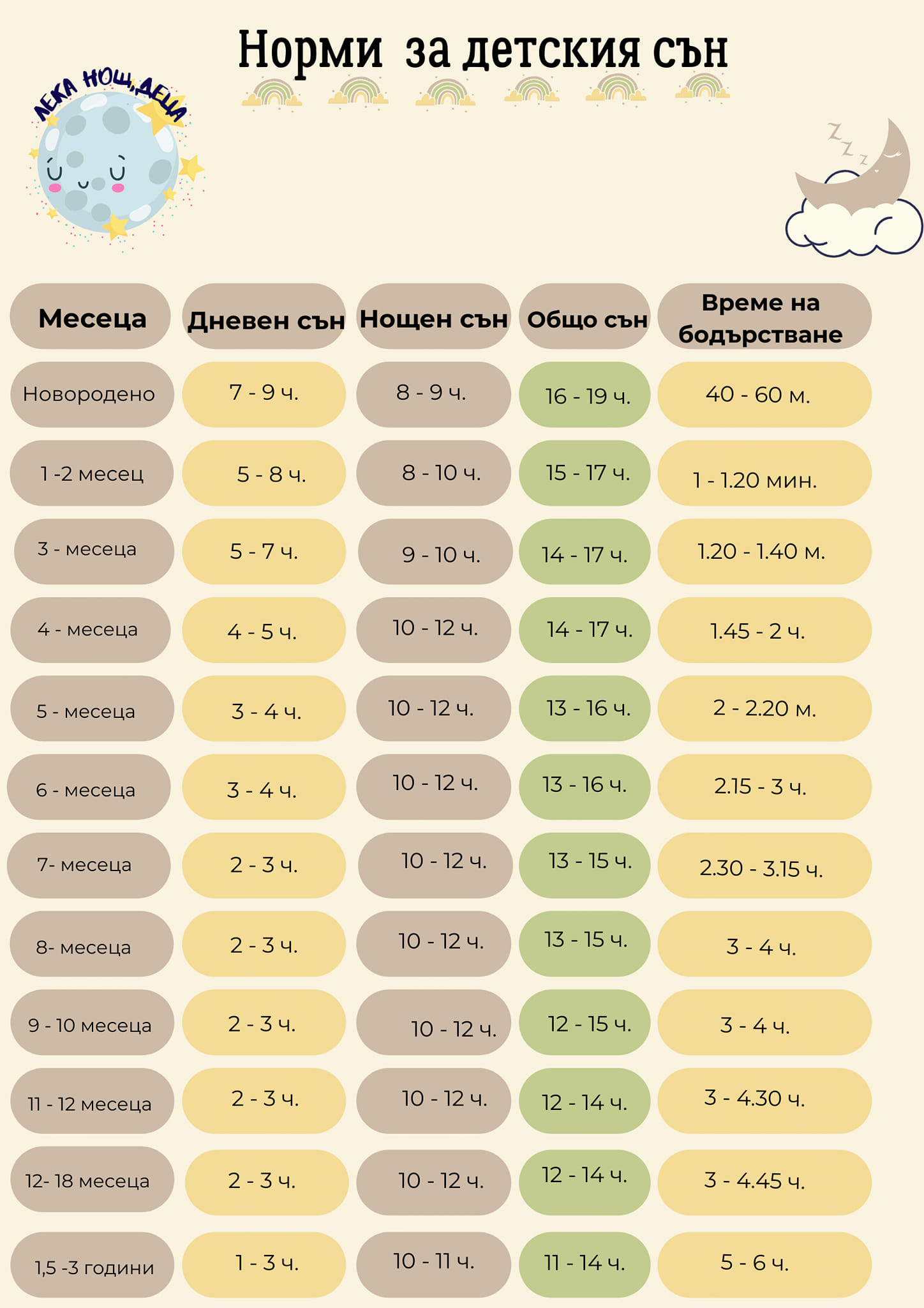 Таблица с нормите за детския сън.Модели на съня на детето според бъзрастта.